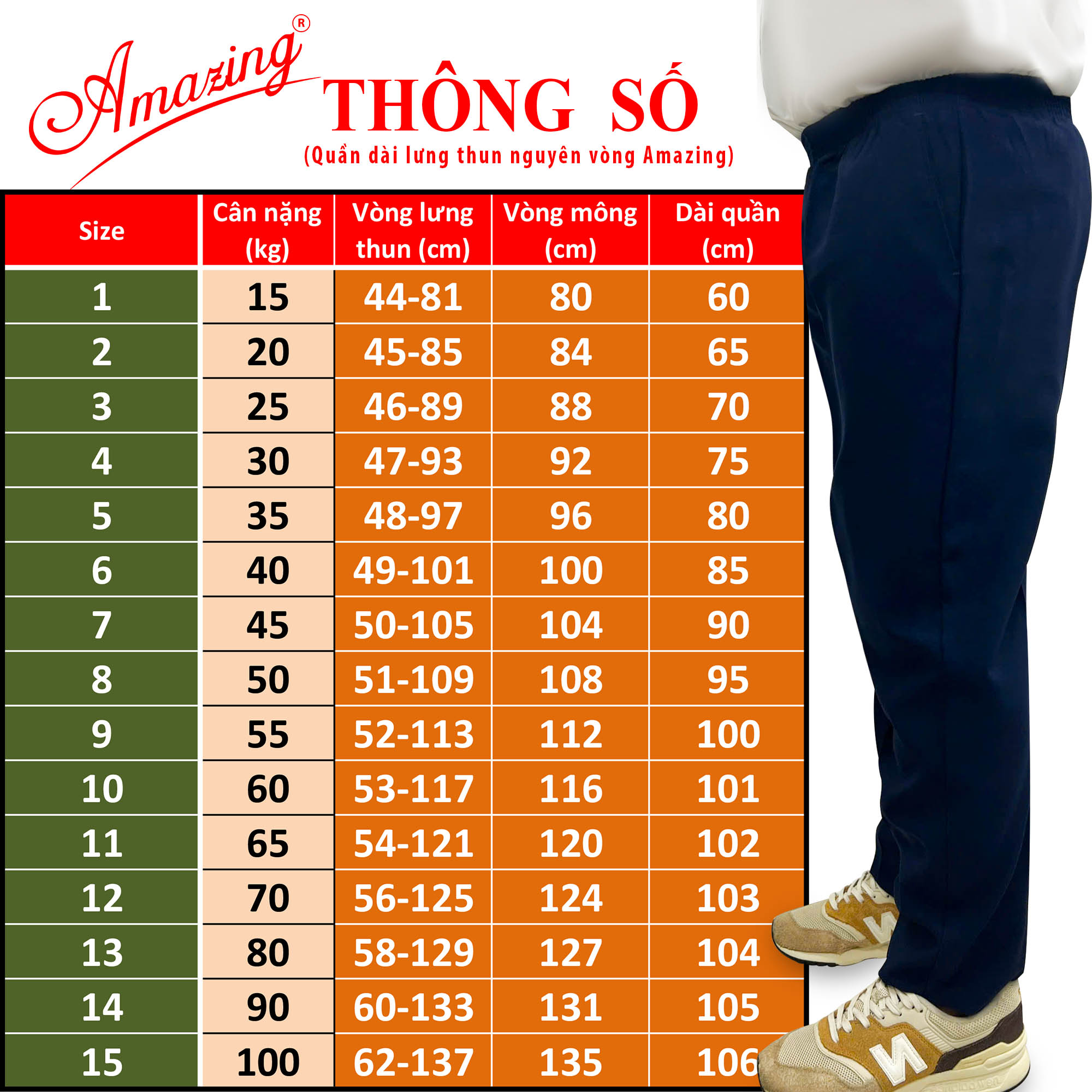 - Quần lưng thun nguyên vòng, 2 túi xéo, form rộng, màu xanh và đen, học sinh nam nữ đều mặc được, size từ 15 đến 100kg, hiệu Amazing